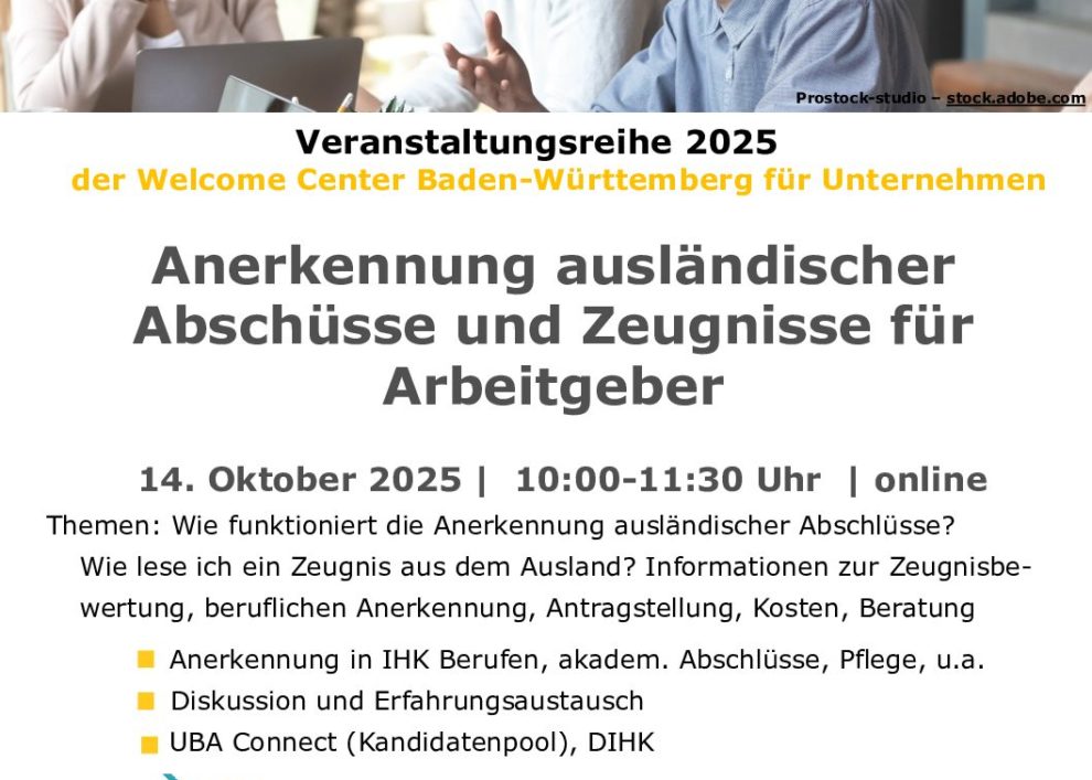 Online-Veranstaltung für Arbeitgeber*innen zur Anerkennung ausländischer Berufsabschüsse und Zeugnisse am Dienstag, 14.10.2025 von 10:00-11:30 Uhr Zielgruppe:…